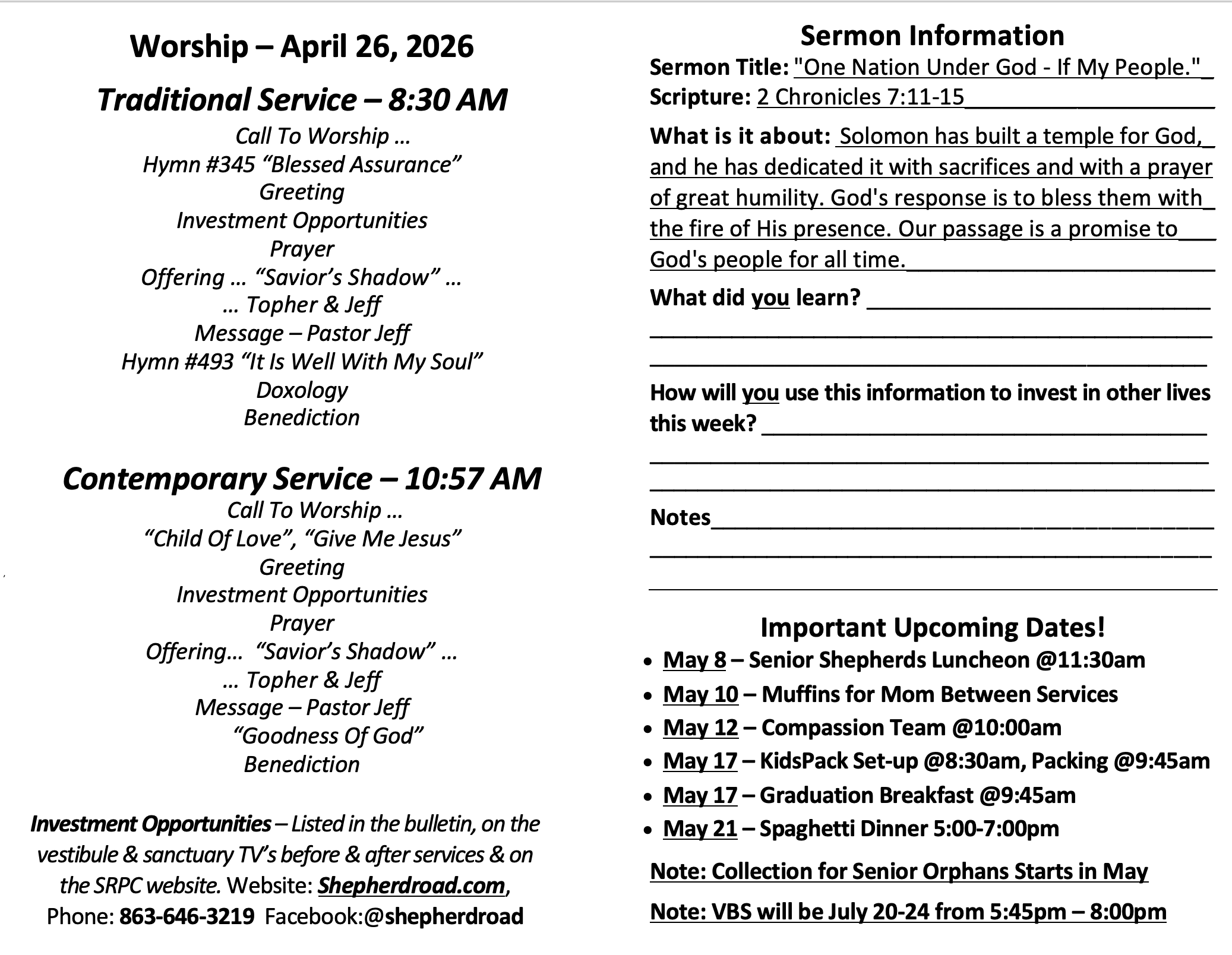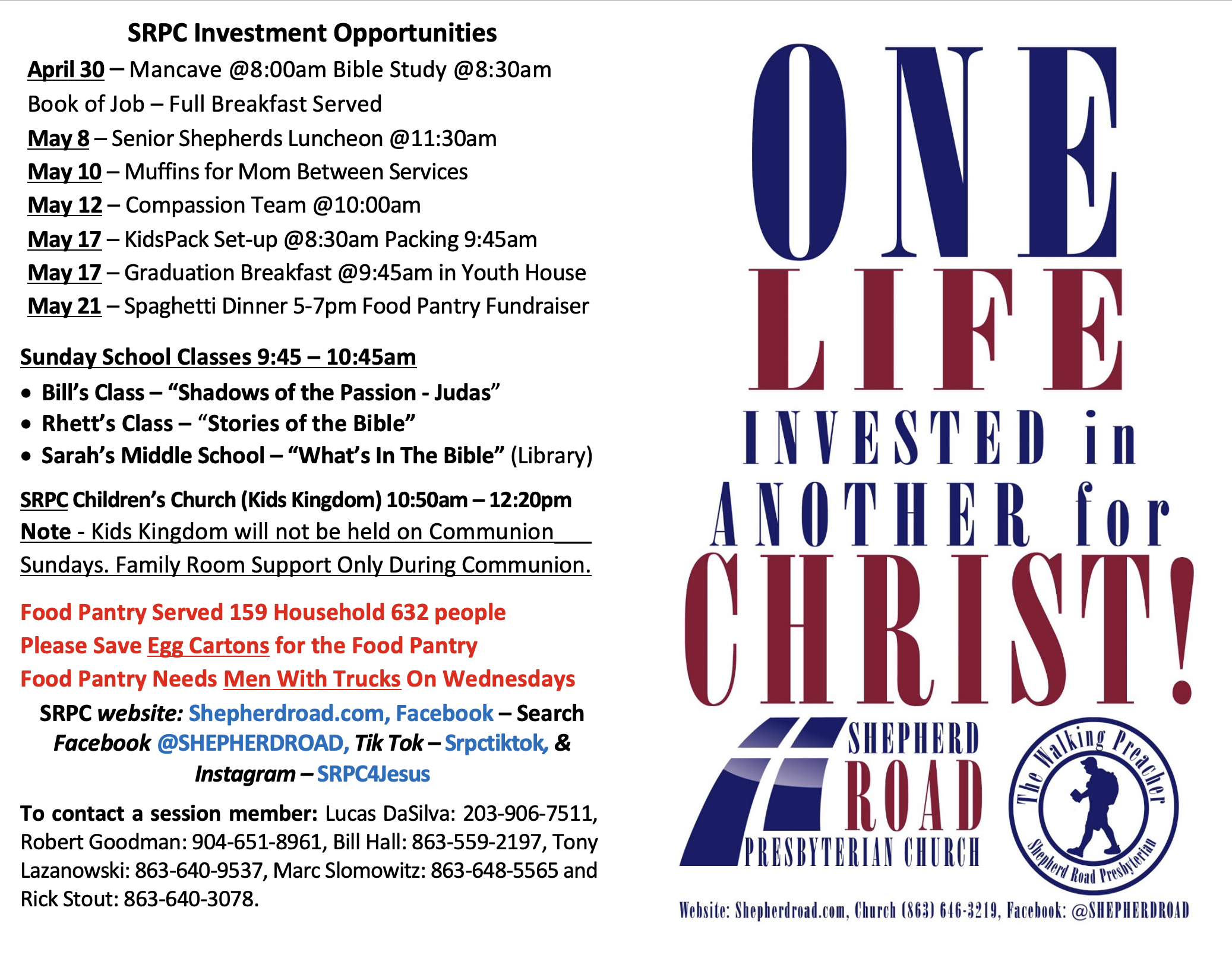 Easter 2026HomeMembership at SRPCHopePrayerAnswersLive Services About Us Plan a visit What To Expect Staff Contact Leadership FAQ The Walking Preacher Music At SRPC Kids Youth Volunteers Food Pantry Missions Man Cave Ministry - Women's Christian Resources Prayer Spiritual Gifts Attenders Weekly Announcements SRPC Christian News Connect with SRPC Hope is a person form Online Giving Elder & Deacon Training SRPC Live first SRPC Live second SRPC Live Combined